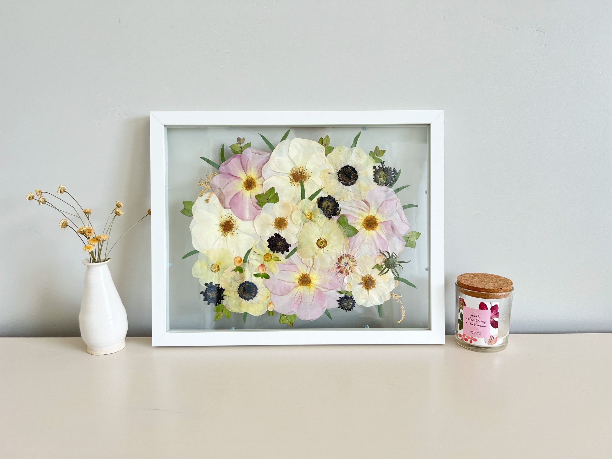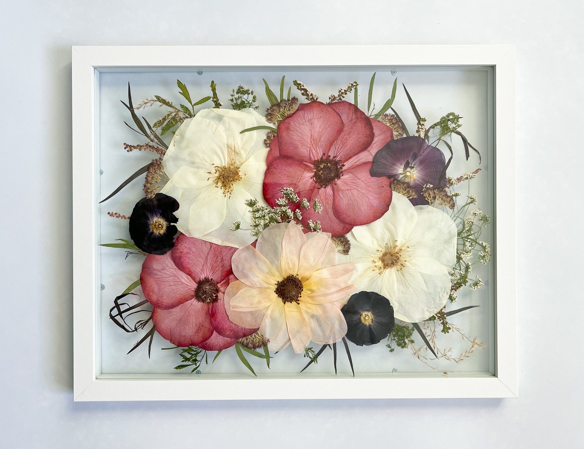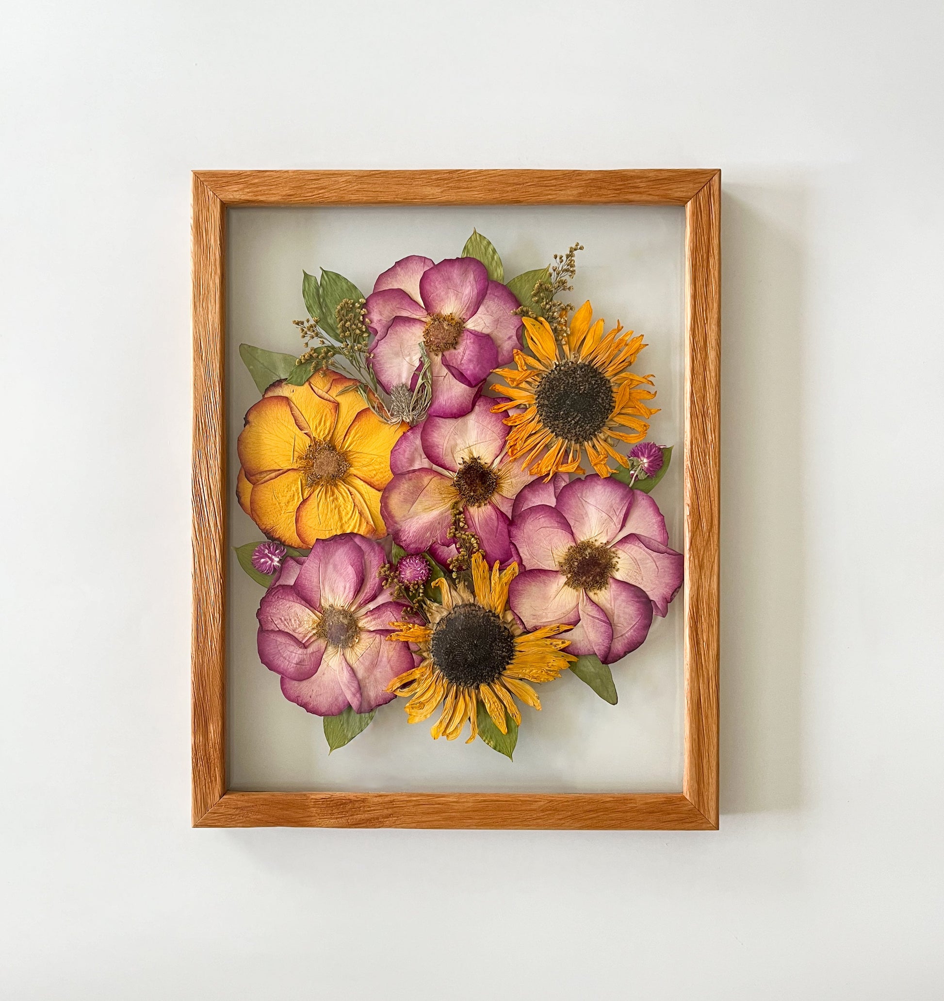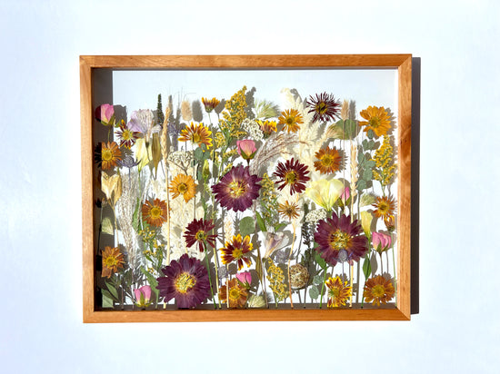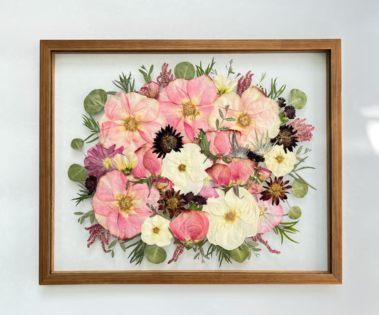Dried flowers can’t be pressed due to the fact that they would crumble with pressure. I offer recreations of bouquets depending on if I am able to purchase those specific flowers at the time.